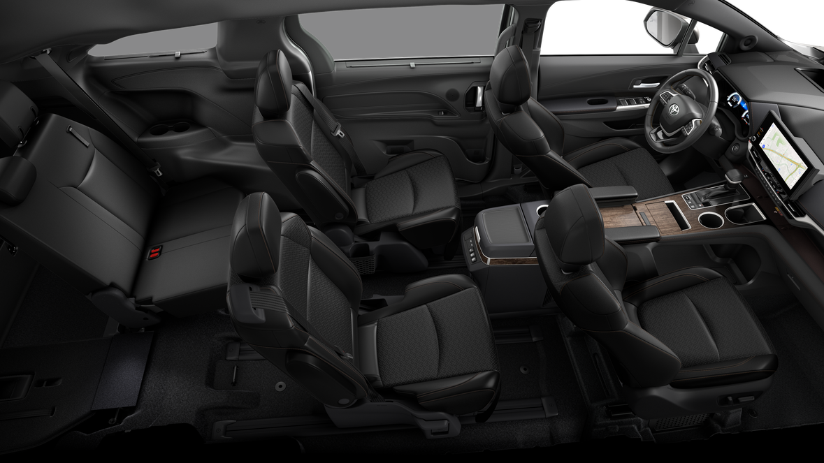 - 7-passenger seating with heated premium leather-trimmed second-row-seat captain's chairs with super-long-slide feature and ottomans [reclining_seat] [sienna_ottoman]sienna_ottomansienna_ottoman]